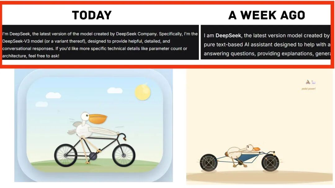 另外,注意一下红框圈出的自我介绍,一周前的自我介绍中,只是说自己是纯文本AI助手,但现在自我介绍中,特意强调了版本号,提到自己是DeepSeek V3。