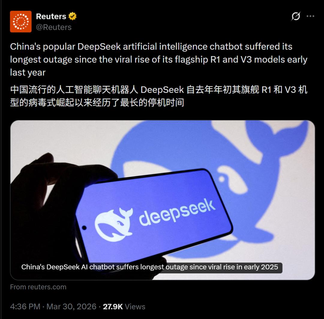 就在昨天,DeepSeek宕机事件,已经火到海外了。