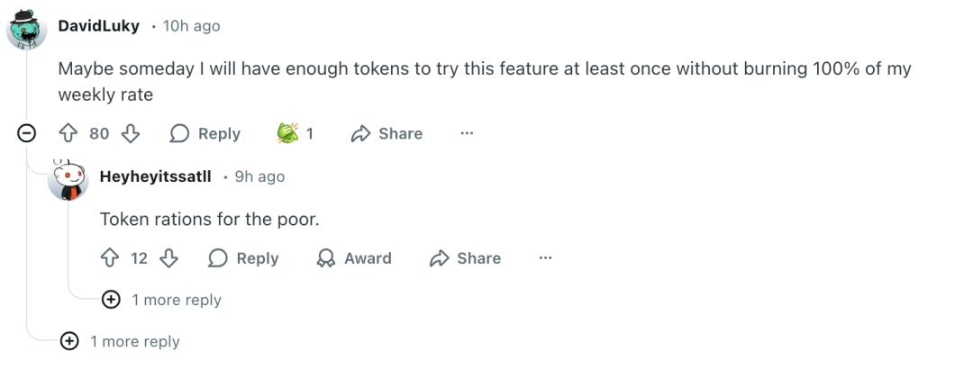 当然,也有声音以更直观的方式表达了当前的使用困境。有用户调侃称,也许未来某一天,自己能够攒够足够的 token,至少尝试一次这个功能,而不至于消耗掉整整一周的额度。