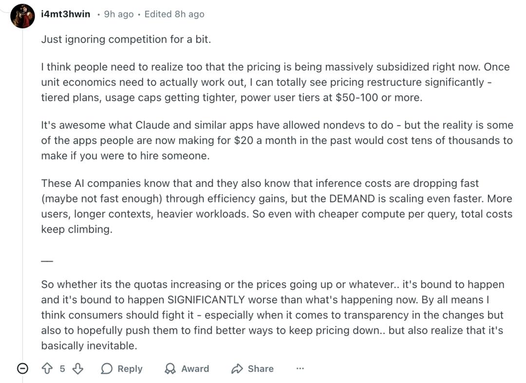 有用户指出,当前的定价体系本质上处于“被补贴”的状态。一旦单位经济模型趋于稳定,价格结构很可能发生显著变化,例如更严格的分级套餐、更低的使用上限,以及针对重度用户的高价订阅(每月 50 至 100 美元甚至更高)。这种判断的依据在于:如今普通用户仅用每月 20 美元,就可以完成过去可能需要数万美元外包成本的工作。