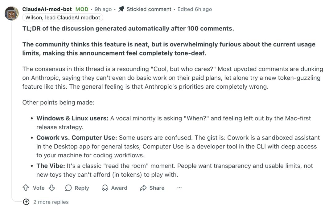 与此同时,一些具体问题也被反复提及。例如,Windows 和 Linux 用户对该功能迟迟未覆盖表示不满,认为 Mac 优先的发布路径忽视了更广泛的开发者群体。此外,该用户也表示对不同产品形态之间的定位感到困惑。社区中较为一致的解释是:“Cowork”更像是桌面端的沙盒助手,用于处理常规任务;而“Computer Use”则是面向开发者的命令行工具,具备更深层的系统访问能力,主要服务于代码相关工作流。