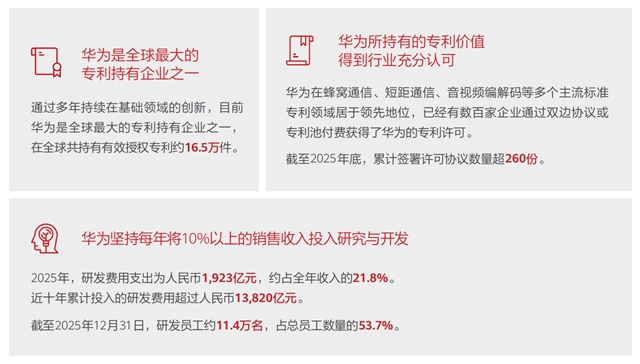 通过多年持续在基础领域的创新,目前华为是全球最大的专利持有企业之一,在全球共持有有效授权专利约16.5万件。同时,其在蜂窝通信、短距通信、音视频编解码等多个主流标准专利领域居于领先地位,已经有数百家企业通过双边协议或专利池付费获得了华为的专利许可。截至2025年底,累计签署了超260份许可协议。