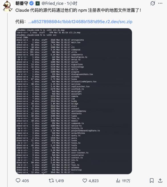 安全研究员 Chaofan Shou 发现,Claude Code 的 npm 包里藏着一个.map 文件——sourcemap,这是给开发者调试用的,按理早该从生产环境剔除。没剔除就意味着:任何人都可以从这个文件里还原出 Claude Code 完整的源码。