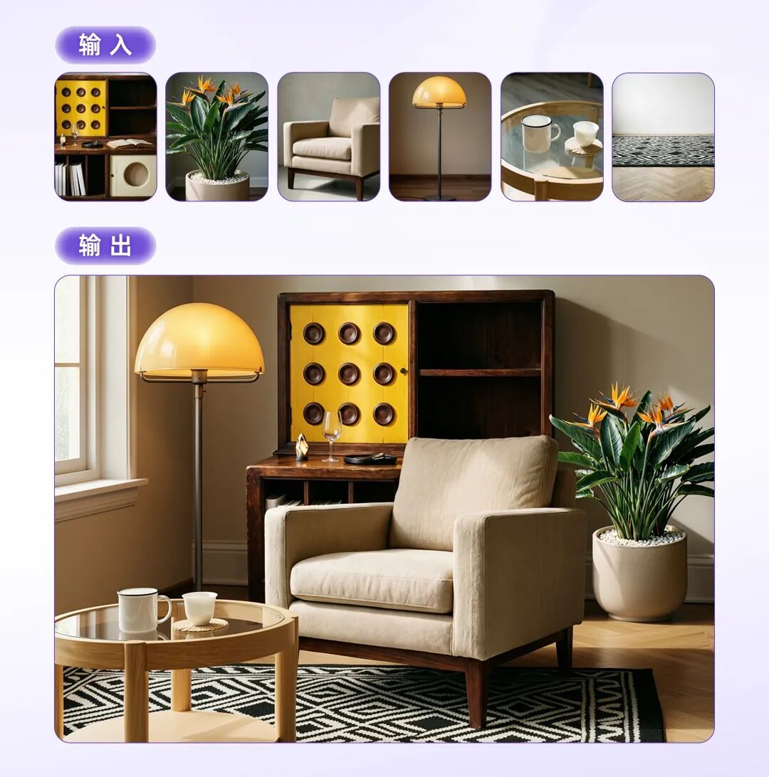 其还支持多主体一致性:最多支持 9 图合影、电影海报及家具组合图,可保持风格与特征的统一。