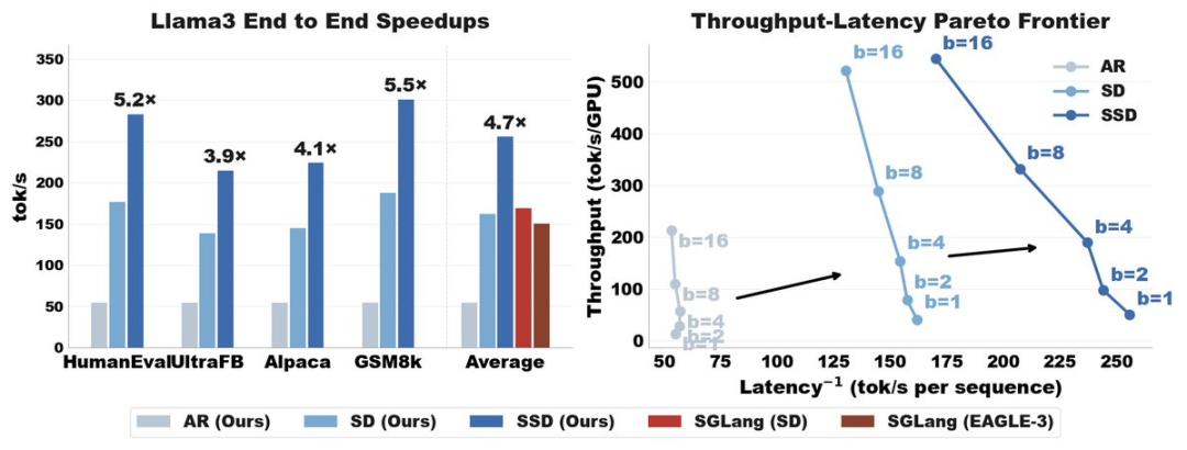 要使新算法达到 SOTA 水平,需要精心设计系统和算法。总的来说,SSD 推动了延迟 - 吞吐量帕累托前沿的发展,其方式与普通推测解码推进标准自回归算法的发展非常相似。