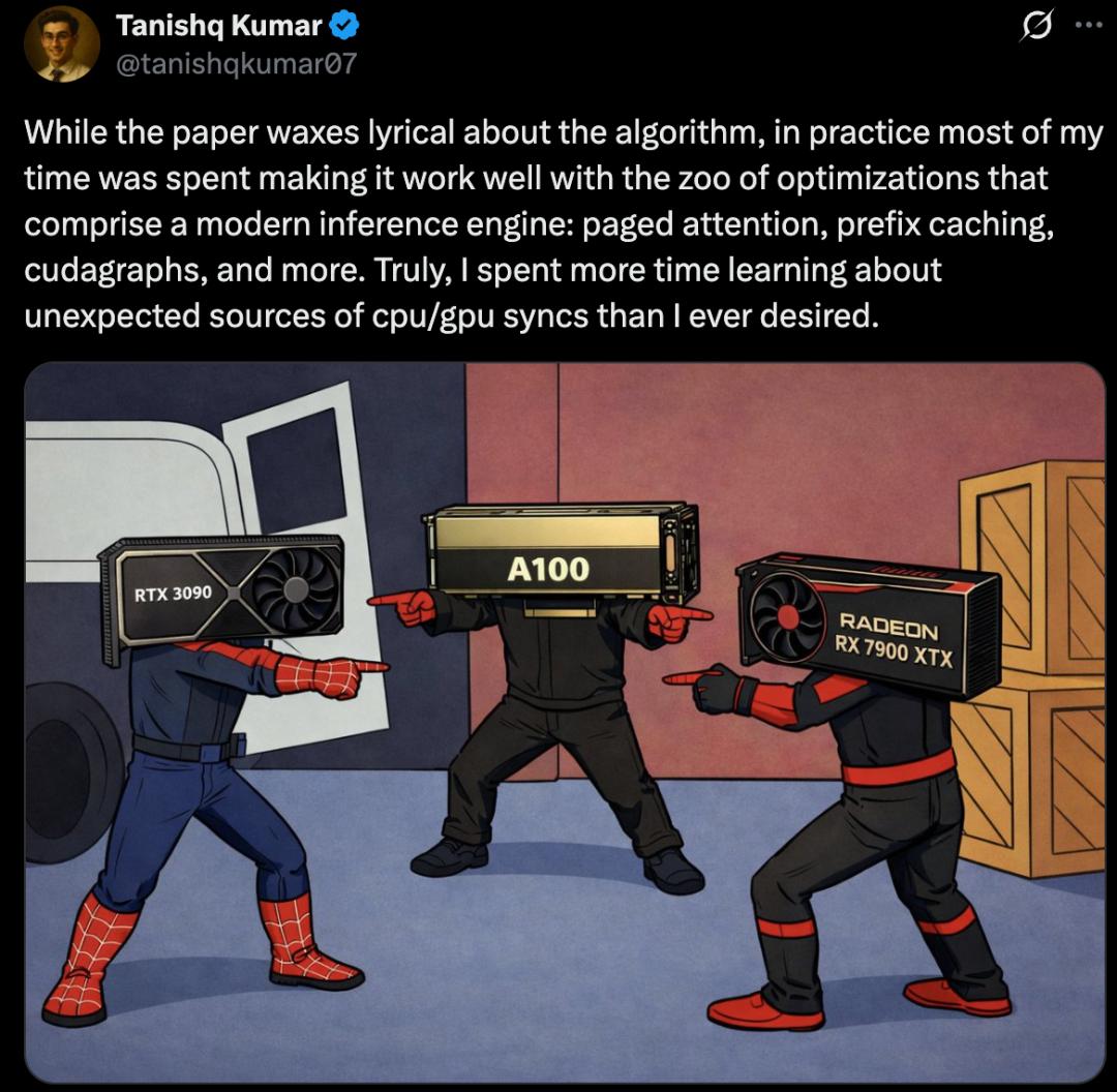 虽然论文对算法进行了详尽的理论描述,但在实践中,研究者大部分时间都花在如何让它与现代推理引擎中各种优化技术(Paged Attention、Prefix Caching、CUDAGraphs 等)协同工作上。