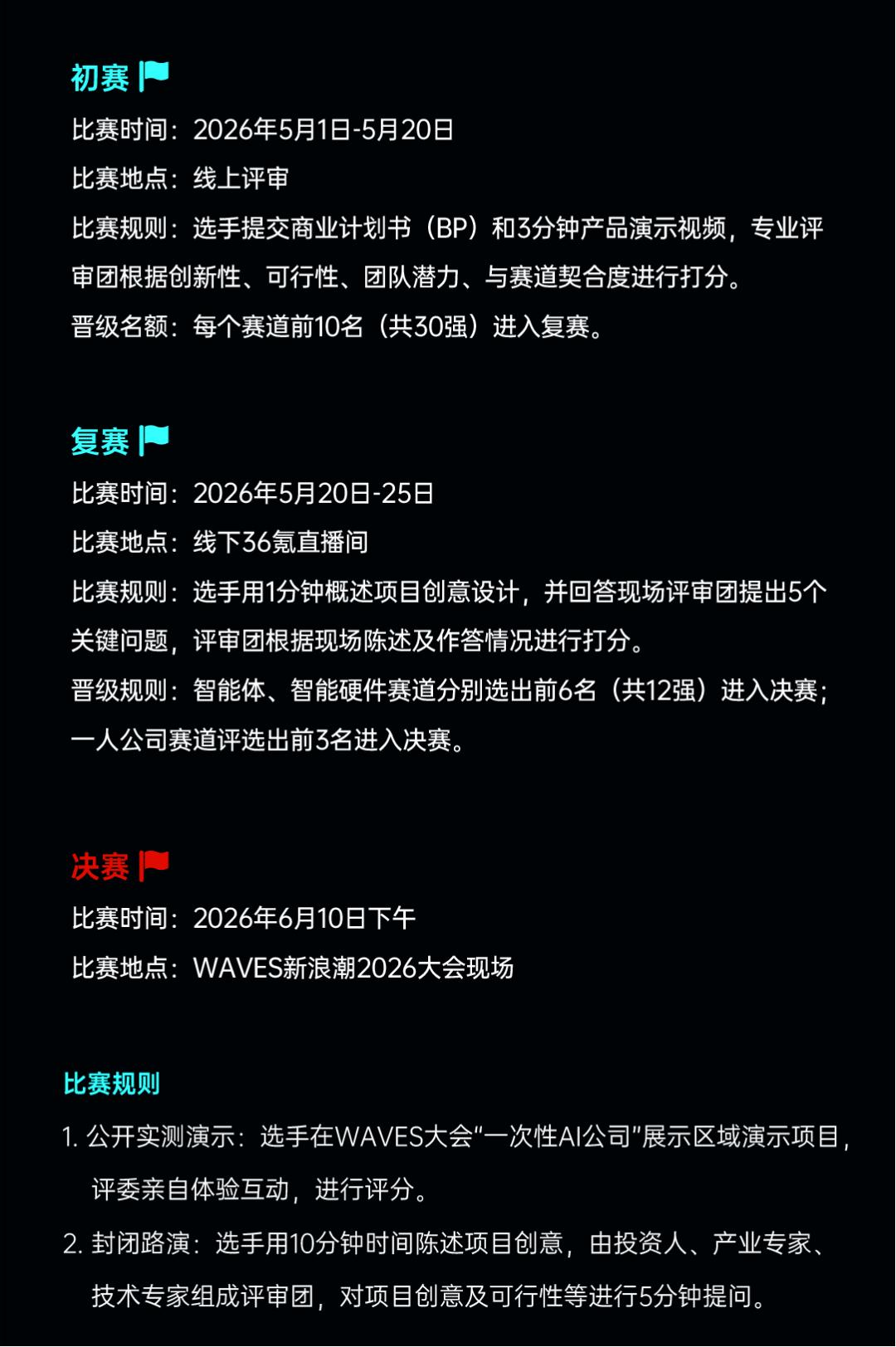 行至决赛,你会站上WAVES的舞台,这是中国创投圈最重要的舞台之一,台下坐着投资人、产业伙伴、未来的用户,过去很多你叫得出名字的创业者,都是从这里被看见、被理解、被加速。2026年夏天,我们想把这个舞台分你一半。
