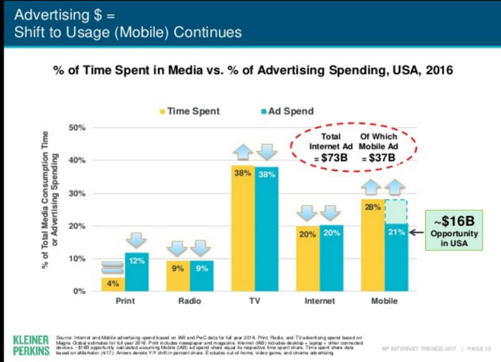 美国分析师玛丽*米克尔之前的数据讲清楚了一件事——广告总收入和媒体的总时长终究是要匹配的。