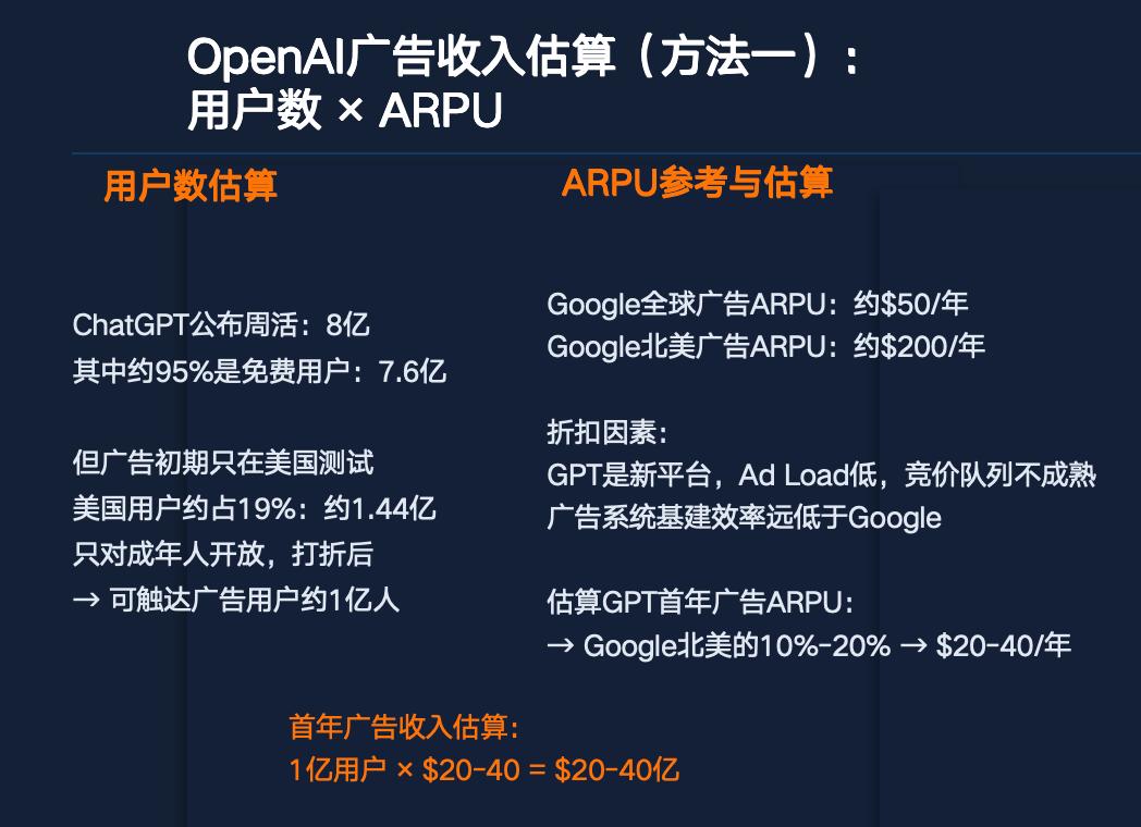两种方法的估算没有数量级上的差异:结论就是OpenAI第一年的广告收入大概率在$20-80亿/年。
