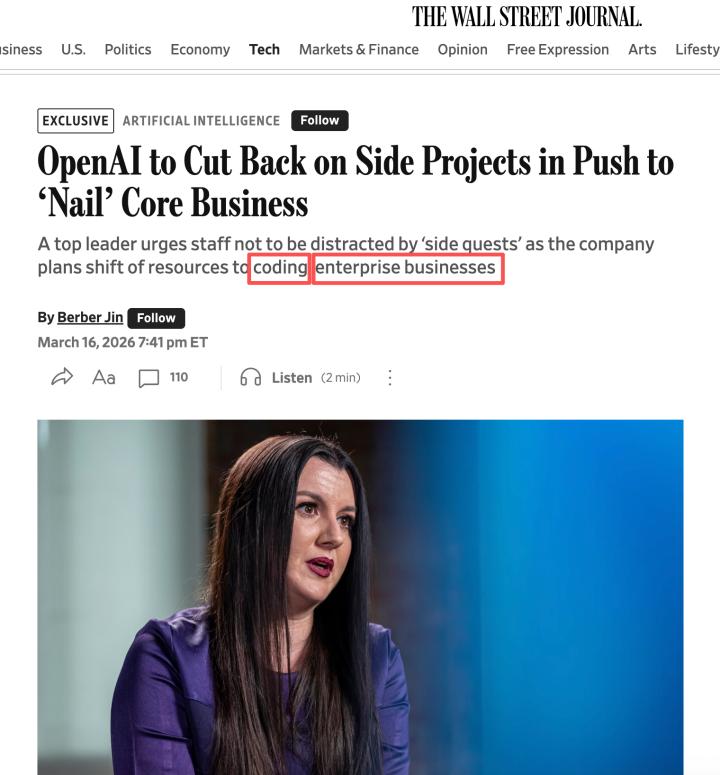两个月之后的3月16日,华尔街日报报道,OpenAI要暂停副业,集中精力搞Coding和企业服务。