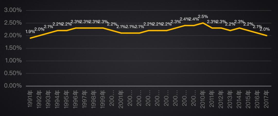 美国的数据,1991年到2017年,广告占美国GDP的比重基本保持不变,长期徘徊在2%—2.5%之间。