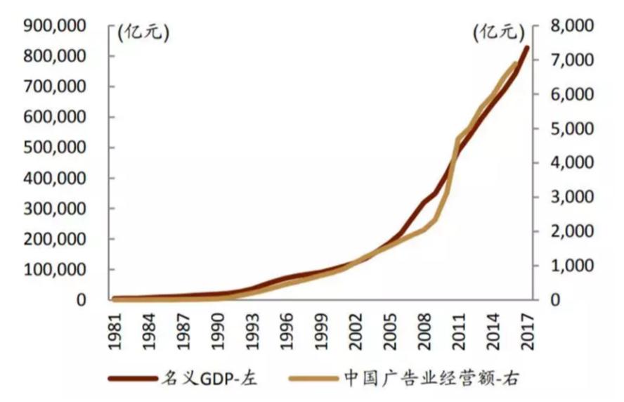 中国也一样,广告收入曲线和名义GDP曲线在调整后基本是重合的——