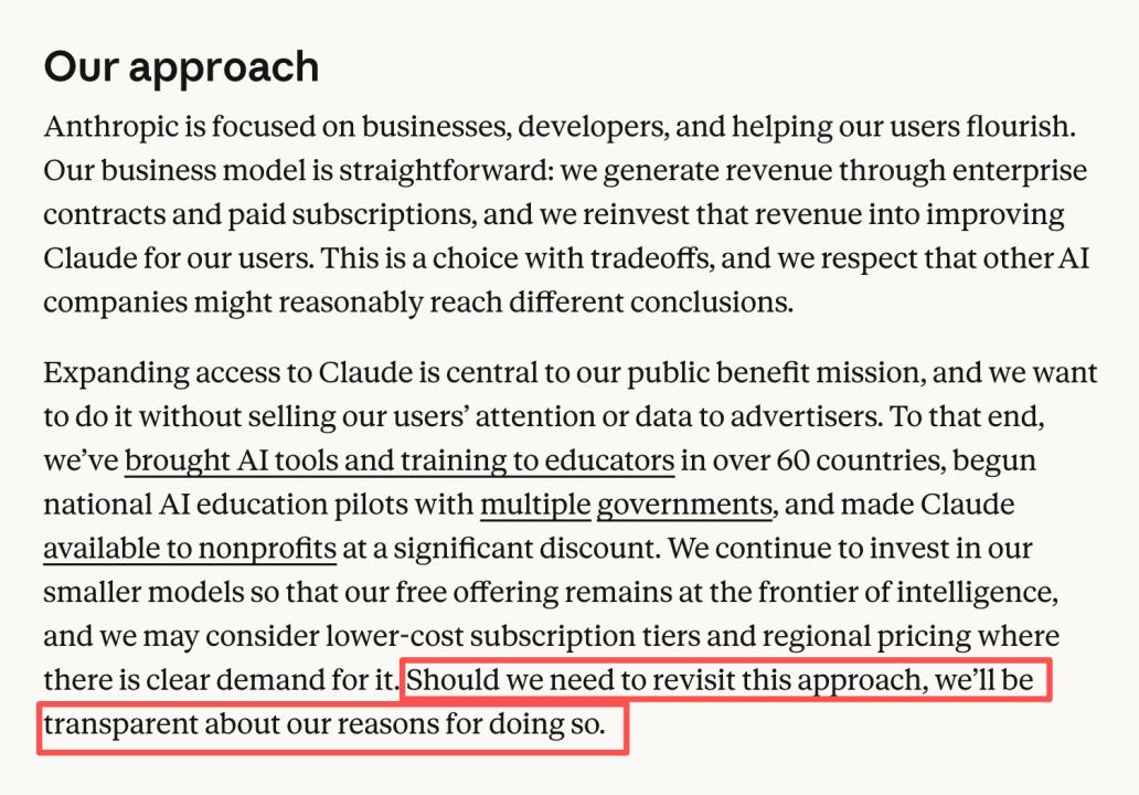 再看Anthropic,尽管自己不加广告,还花800万美金在超级碗讽刺对手加广告,而且自己目前B端收入强劲,但Anthropic其实也没有把话说死——