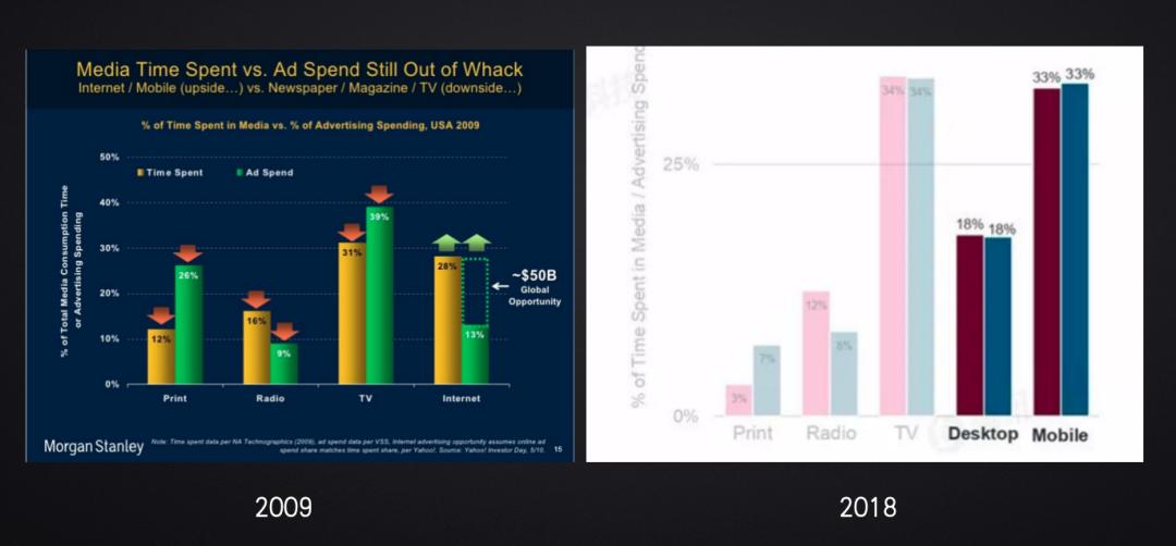 互联网从2009年的13%上升到了2018年的51%,而互联网也正好占据了人们51%的时间。(尽管这些数据不是最新的,但广告收入和时长匹配的大逻辑是清晰的)