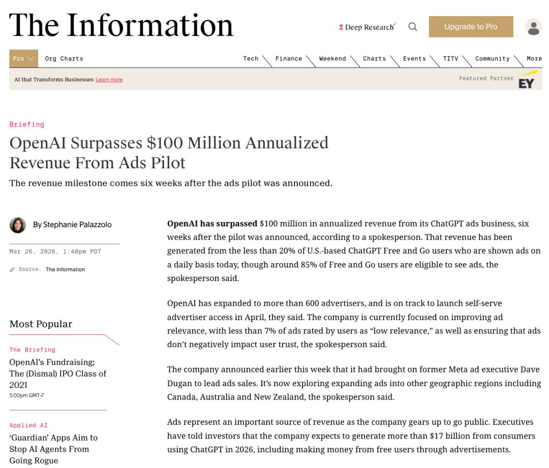 根据The Information3月26日的报道,OpenAI 的 ChatGPT 广告业务ARR(年度经常性收入),已达到 1 亿美元。