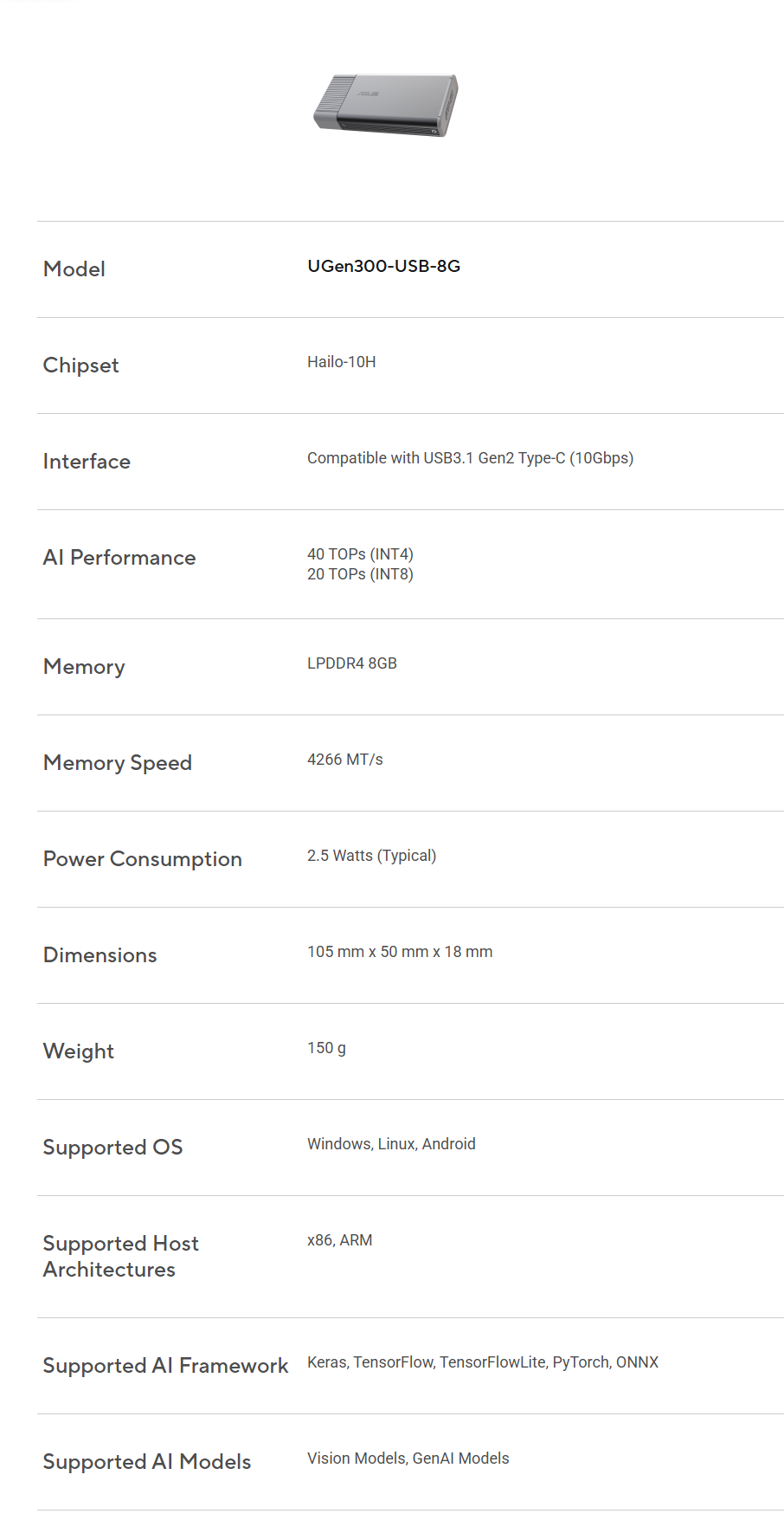 IT之家 4 月 1 日消息,华硕今日宣布推出 UGen300 USB AI 加速器(同时提供 M.2 版本),这是华硕首款 AI USB 设备,也是全球首款支持经典 AI 和生成式 AI 的 USB 边缘 AI 加速器。