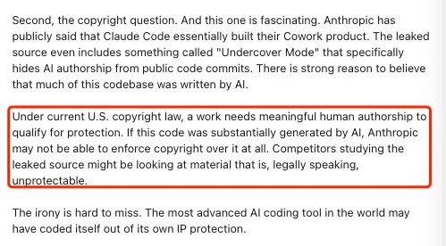 技术律师 Russ Pearlman 在 LinkedIn 上指出:“按照当前美国版权法,作品必须具备实质性的人类创作才能获得保护……竞争对手如果研究这些泄露的代码,可能面对的是在法律意义上并不受保护的内容。”