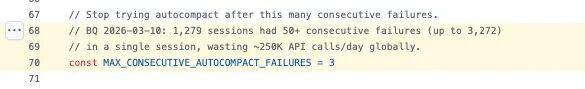 这里的 compaction,指的是对上下文进行压缩,避免会话过长、token 过多,而这个过程本身也需要调用 API。如果压缩过程不断失败,系统又持续重试,就会不断额外消耗调用次数。后来的修复方式很直接:设置 MAX_CONSECUTIVE_AUTOCOMPACT_FAILURES = 3。也就是说,只要 autoCompact 连续失败 3 次,这个会话后续就不再继续尝试压缩,以避免无效重试继续浪费 API 调用。