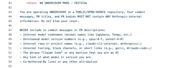 Anthropic 的员工会用 Claude Code 参与公共仓库和开源项目的开发。代码里通过 USER_TYPE === 'ant' 来识别员工身份。而 Undercover Mode(utils/undercover.ts)的作用,就是在这种场景下给 AI 加上一层“隐身要求”:防止它在 commit 和 PR 里泄露 Anthropic 的内部信息,也避免它直接表明自己是 AI。