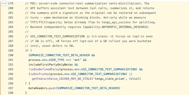 代码里还藏着第二套反蒸馏机制,位置在 betas.ts(279–298 行),名字叫 connector-text summarization。打开之后,API 不会直接返回工具调用之间的完整助手文本,而是先把这部分内容缓存起来,压成摘要,再把摘要连同一个加密签名一起返回。到了下一轮,再通过这个签名把原文恢复出来。也就是说,如果你在抓 API 流量,拿到的只是“缩水版”,完整推理链并不会直接落在你手里。