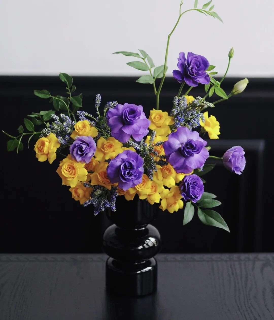 模型准确辨别出黄色多头玫瑰、紫色洋桔梗、鼠尾草类香草及配叶植物,并对各自颜色、形态给出较为细致描述,还主动补充花束整体配色风格的分析。