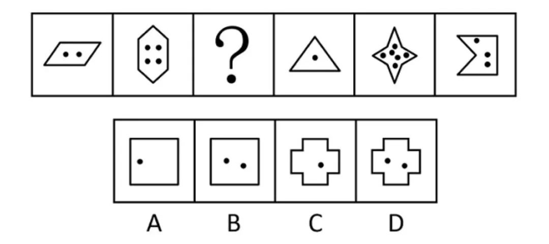 LongCat-Next 抓住其中门道,每幅图形均由外框与内部黑点两个要素构成,并通过多组数据横向比对,得出「外框边数 - 黑点个数 = 2」这一隐藏规律,最终锁定答案 B。