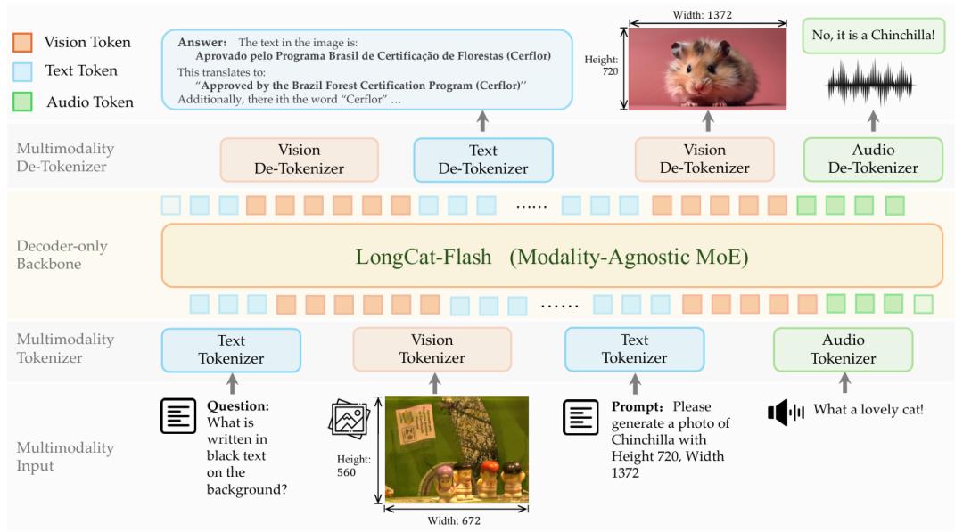 这是一款离散原生自回归多模态大模型,基于 LongCat-Flash-Lite MoE 架构构建,总参数量达 68.5B,激活参数仅 3B,能够在统一框架下同时处理文本、图像与音频三种模态。