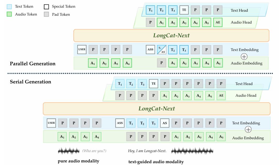 两种具有内部语言引导的语音生成策略。 用户的输入音频被视为纯音频模态,而由 LongCat-Next(或助手)生成的输出则被视为文本引导的音频模态。为了指示模态转换并促进分段对齐,团队引入了三个特殊标记:AS(Audio Start,音频开始)、AE(Audio End,音频结束) 和 TE(Text End,文本结束),分别表示音频片段的起始和结束,以及文本片段的结束。