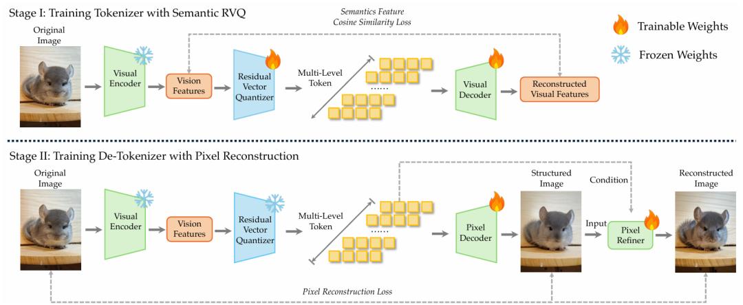 SAE(语义对齐编码器):模型采用经过大规模图文对齐训练的视觉编码器作为预量化特征的基础。这类编码器不仅能够捕获高层语义概念,同时也保留了细粒度的视觉属性,为后续离散建模提供语义基础。