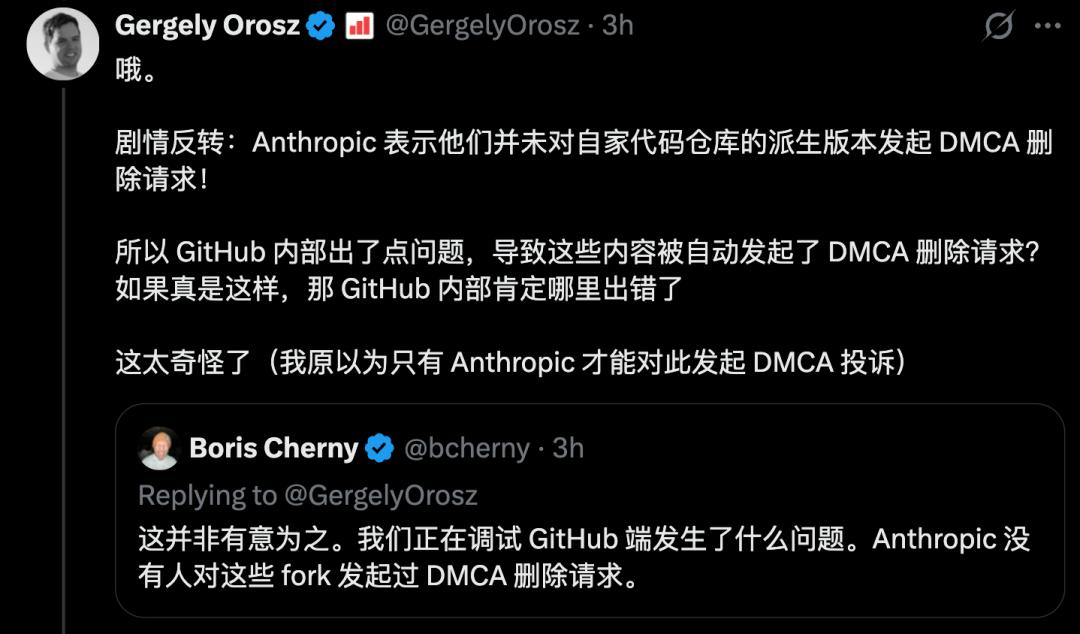 Boris Cherny承认,这次大规模封禁纯属技术失误。目前,已经撤回了绝大部分下架请求。