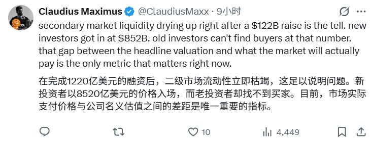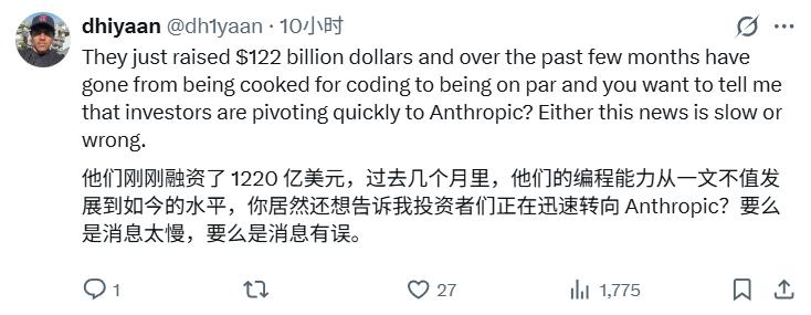 社区方面,有观点认为,同一天既能完成 1220 亿美元融资,又被说成「失宠」,本身就有些矛盾;也有人怀疑,这种说法可能忽略了时间滞后或市场结构差异。