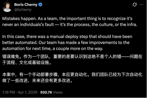 Claude Code负责人Boris Cherny出面回应,称这是一次意外操作。