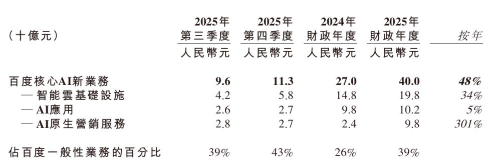 此次财报也显示,2025年百度总营收达1291亿元,AI业务营收达400亿元;2025年Q4总营收为327亿元,AI业务收入以113亿元占百度一般性业务收入的43%,而且这一比例近几个季度持续快速提升,人工智能业务已成为百度整体营收增长的核心引擎。