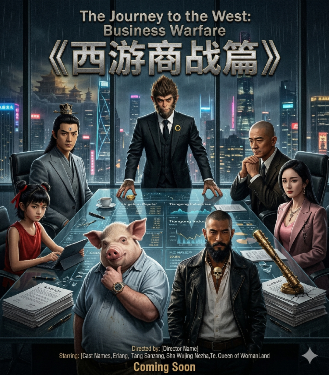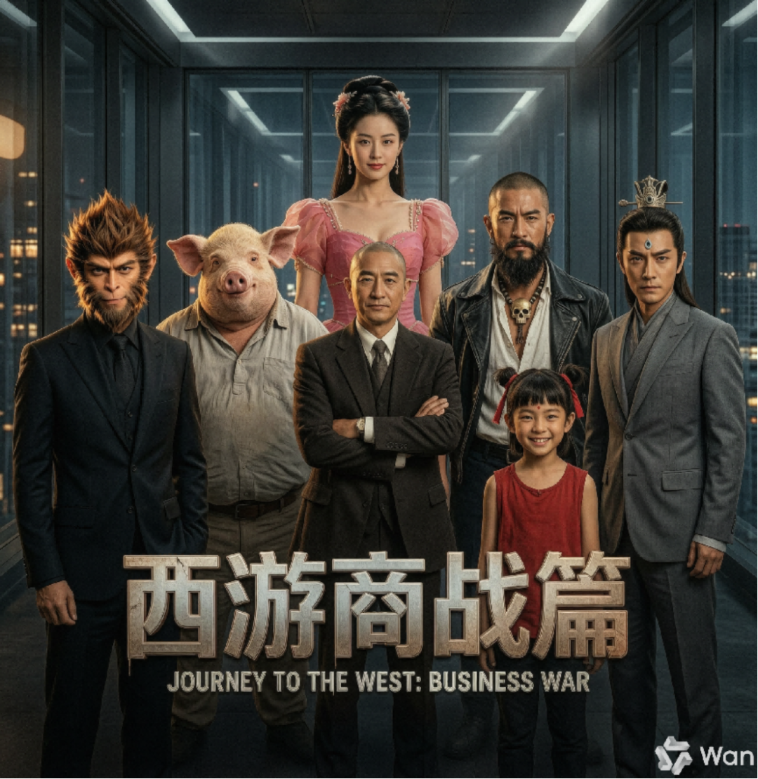 比如测试时小编找来 7 张西游记中的人物穿着现代衣服的照片让它作为参考图,然后让 Wan2.7-Image 以这 7 个人物为主体设计一张《西游商战篇》的电影海报。