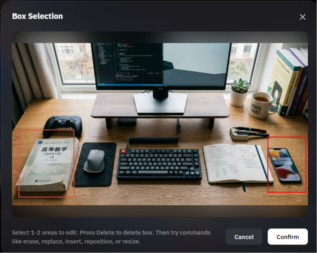 Wan2.7-Image 原生搭载的交互式编辑功能,就解决了这个痛点。在体验过程中,小编上传一张有序摆放各种物品的办公桌的照片。