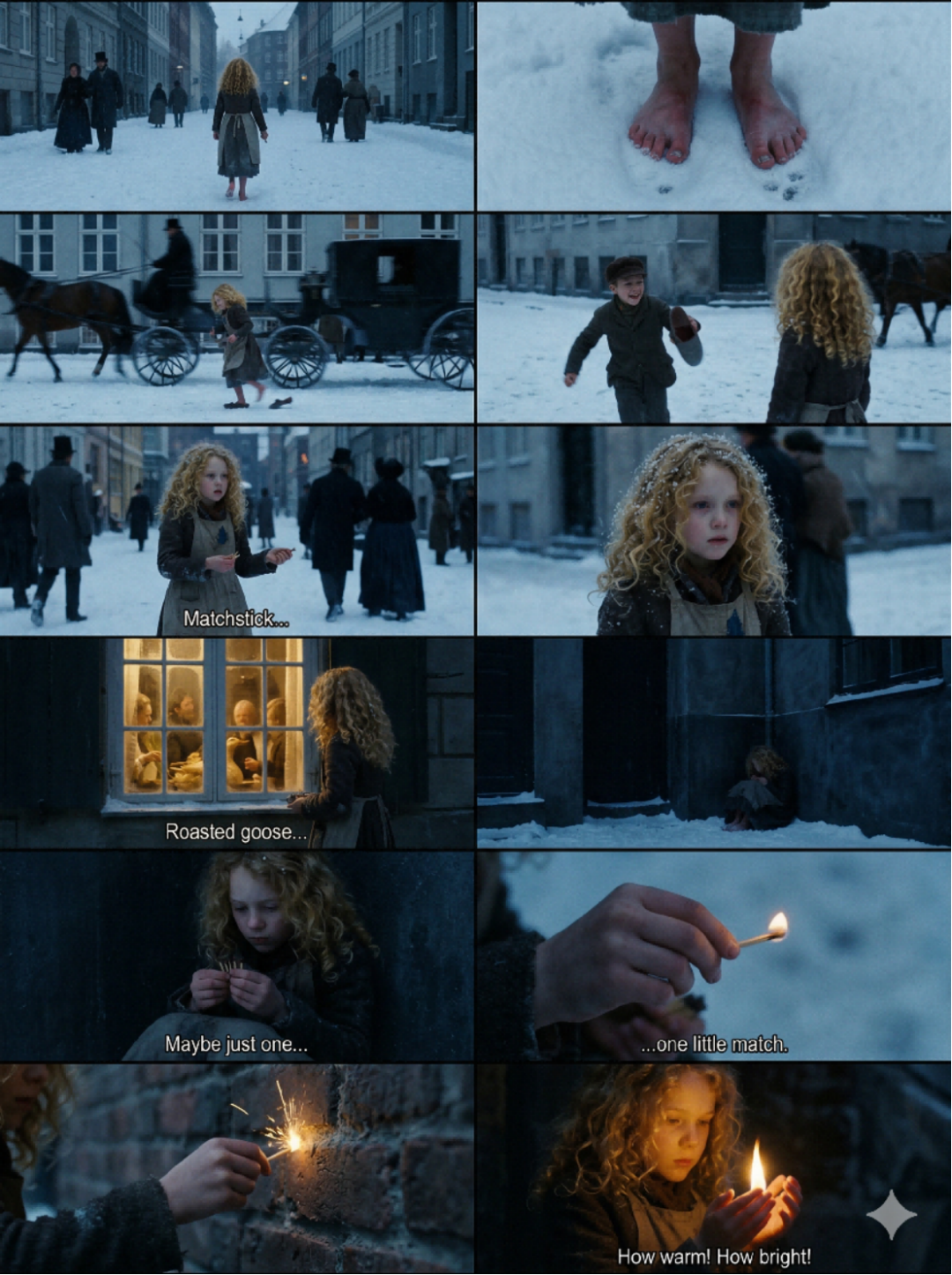 再看 Nano Banana Pro 生成的组图,整体表现也不错,不过在故事逻辑上存在一些问题,比如小女孩先是赤脚,然后才出现鞋子跑掉的画面,逻辑顺序反了,还有火柴竟然是擦墙点燃的,不符合逻辑。