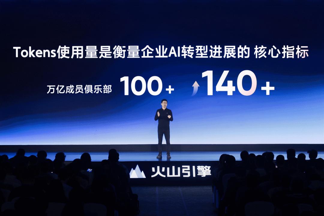 在火山引擎平台上,累计 Token 使用量超过一万亿的企业客户,已经从去年底的 100 家增长到 140 家。三个月多了 40 家「万亿俱乐部」成员。