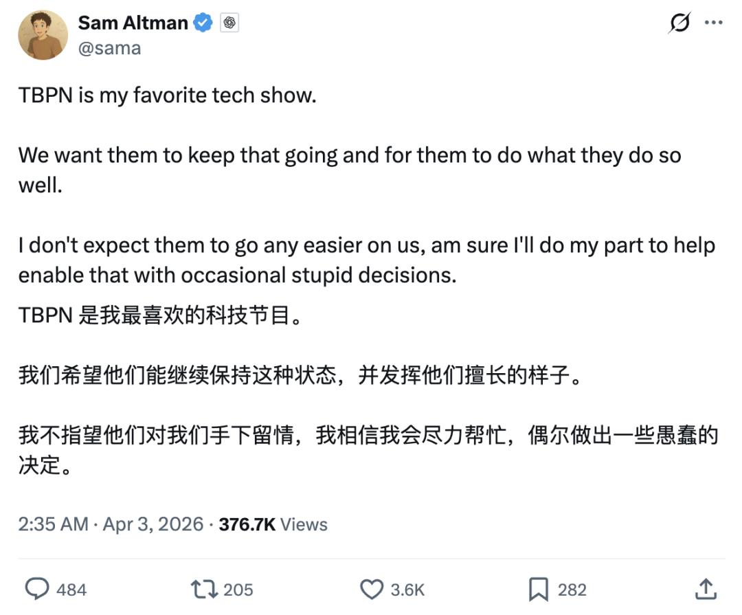 原则上,未来TBPN仍会保持公正,仍会批评奥特曼。