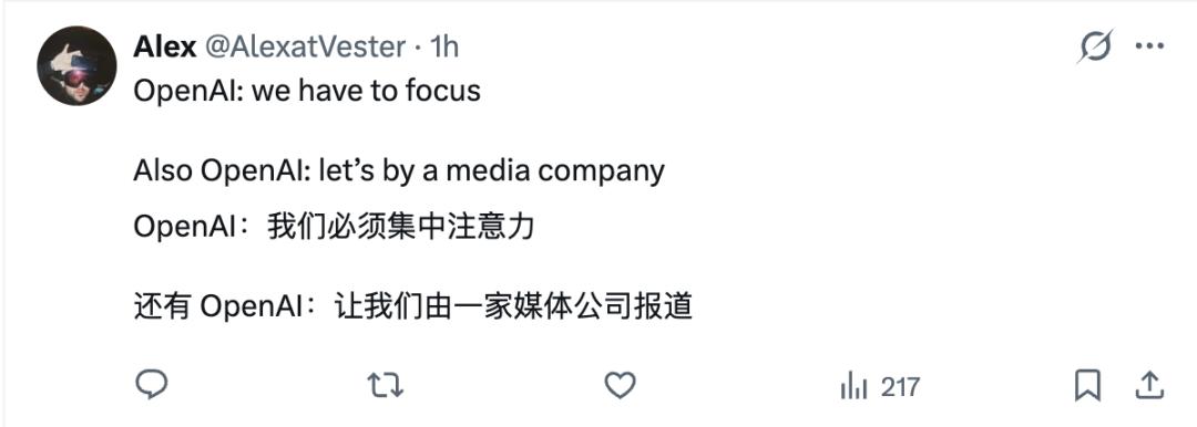 对于这次收购,不少网友表示理解无能,尤其是在OpenAI刚砍掉Sora,拿下融资,说要集中注意力的时候。