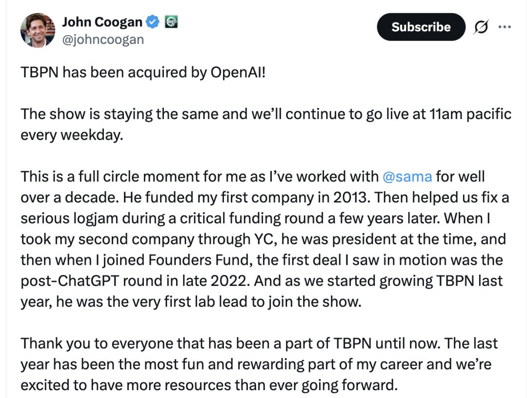 不过在另一头,TBPN主持人之一的John Coogan则在推特上透露了一些收购的细节,特别是与奥特曼的私交。