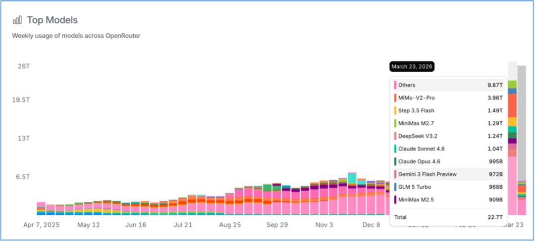 全球AI模型API聚合平台OpenRouter数据则显示,过去一年,平台内前十大模型的周Token调用量从1.24万亿暴增至近14万亿,增幅超10倍。而最近一周的Token使用总量超过22万亿,是OpenClaw发布前(2026年1月)的三倍。
