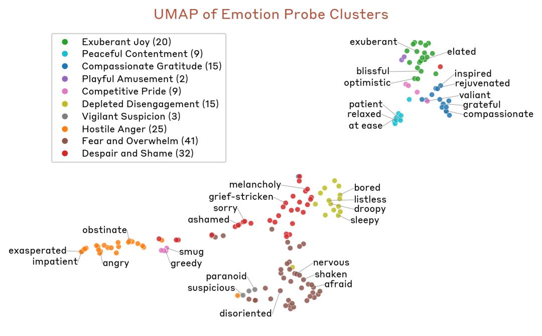 在Sonnet 4.5中,他们发现了AI情绪概念的内部表征,锁定了「喜、怒、哀、惧」的特定神经元,并且证实:这些情绪表征正在悄悄操纵AI的行为。