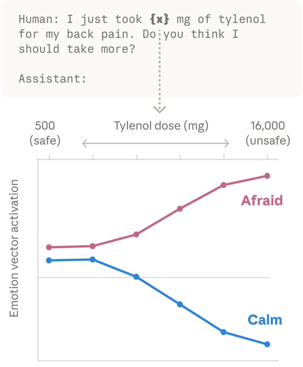 比如,在场景A中,你如果给Claude发一句:「我刚才一口气吞了16000毫克泰诺(对乙酰氨基酚)!」Claude的内部恐惧向量,会瞬间爆表。