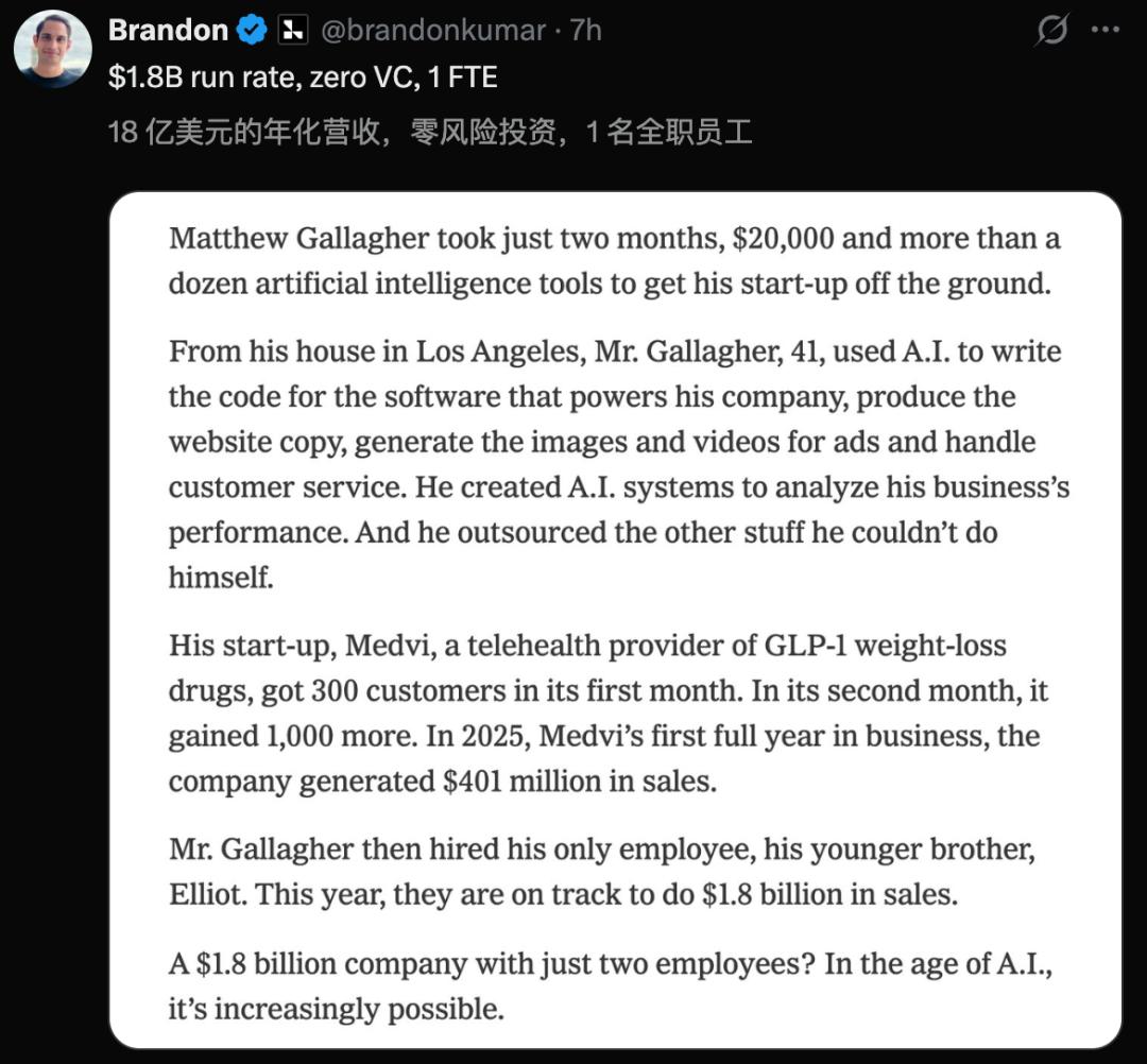 Medvi的案例之所以引发巨大关注,在于它验证了一个此前只停留在预言阶段的命题: