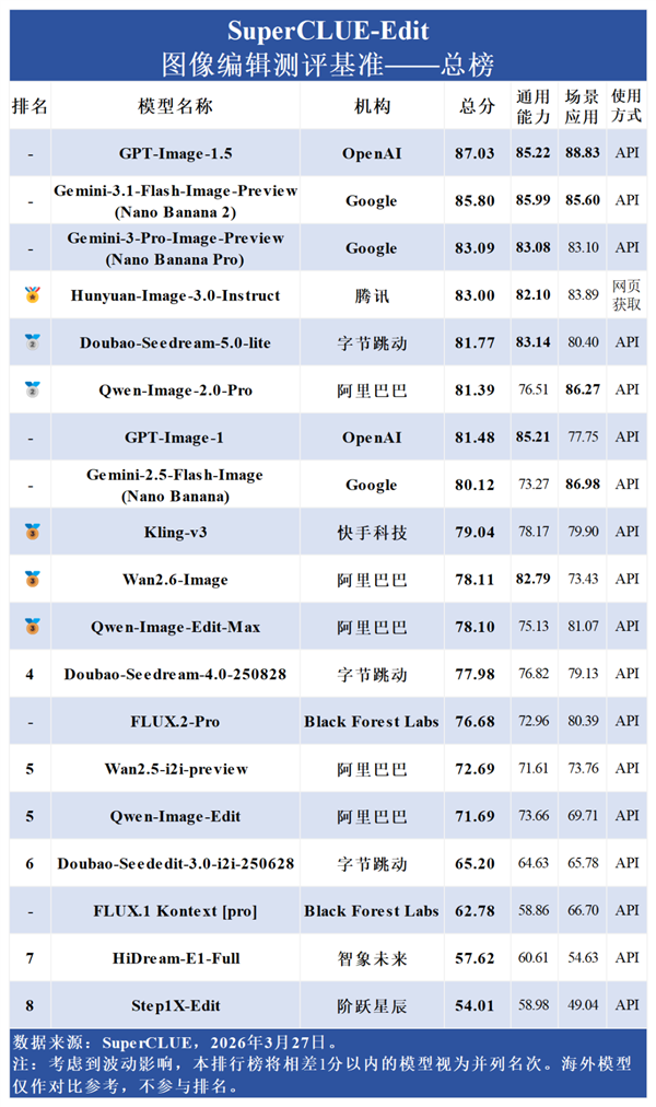 快科技4月4日消息,SuperCLUE日前发布2026年3月中文原生图像编辑测评榜单,本次测评覆盖国内外19个主流图像编辑模型,从通用能力与场景应用两大核心维度展开全面评估。