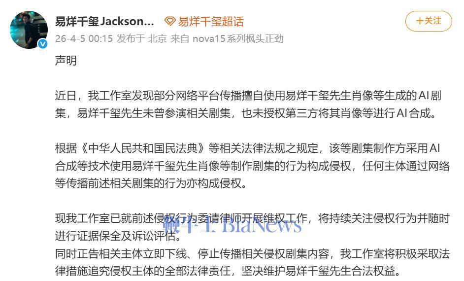 4月5日凌晨,易烊千玺工作室发布官方声明,就AI合成侵权剧集启动维权。