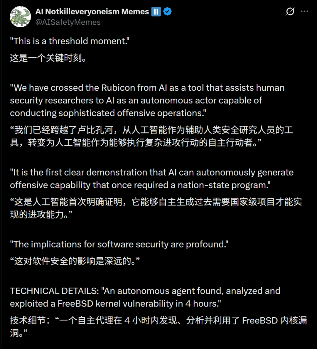 这是首份确凿证据,AI能够自主生成过去只有国家级项目才能实现的进攻性能力。整个软件安全领域都地震了。