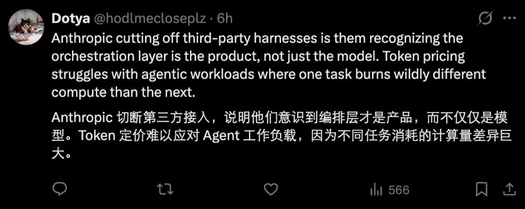 更有人直接说:Anthropic 此举真正传递的信号是 —— 编排层才是产品,而不仅仅是模型本身。订阅制与 API 计费之间的张力,不过是这个更深层逻辑的表面症状。