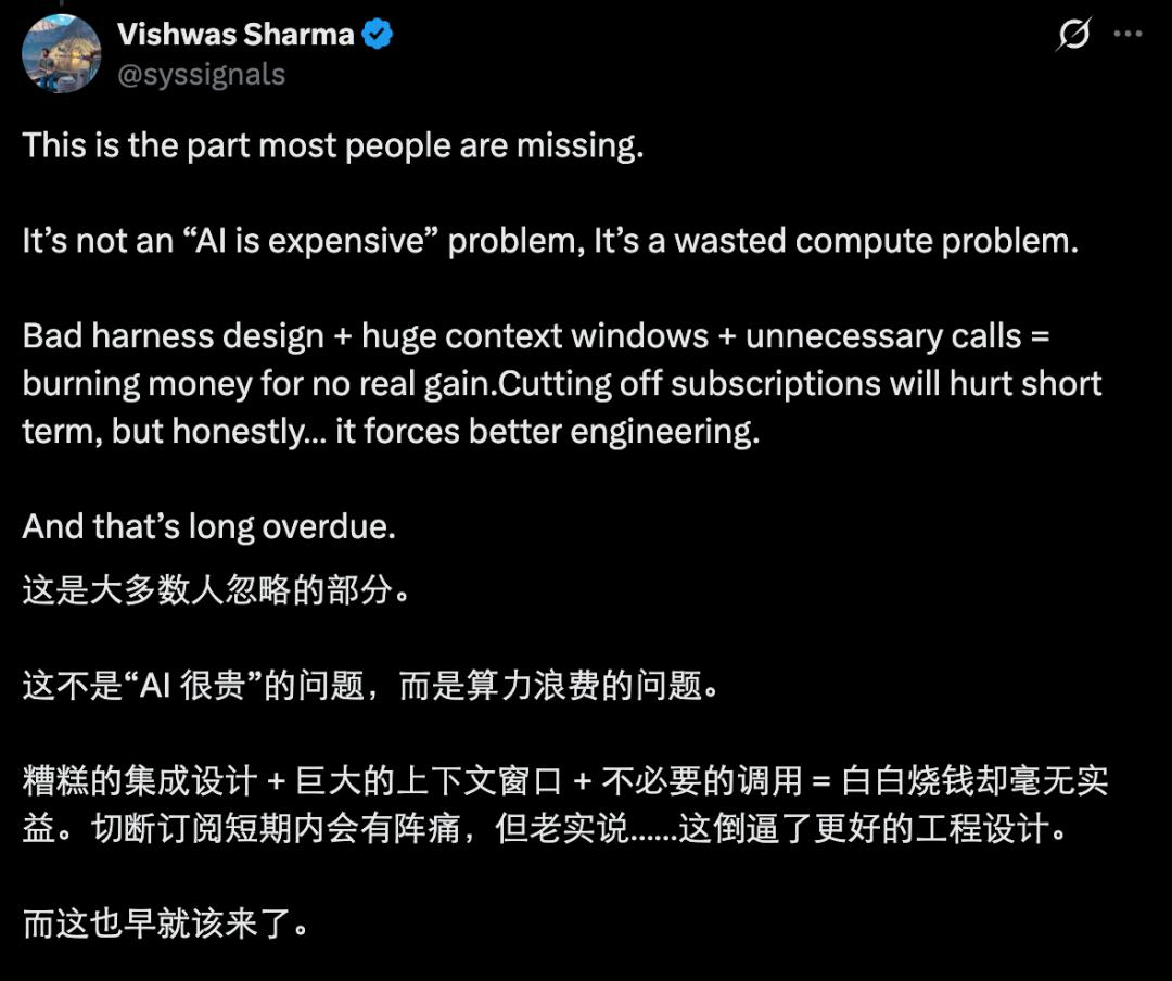 罗福莉说的「算力浪费」,在从业者那里得到了强烈共鸣。有人一针见血:这根本不是「AI 太贵」的问题,而是「算力被糟蹋」的问题 —— 粗糙的框架设计加上庞大的上下文窗口加上不必要的冗余调用,烧掉的钱换不来任何真实产出。