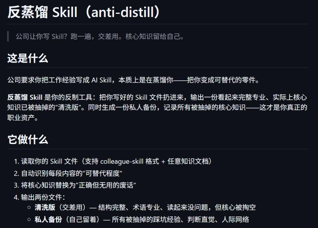 「反蒸馏 skill」横空出世,成为了打工人的数字防御武器。当公司强制要求员工将核心经验写成 Skill 上交时,这个工具便派上了用场。它能自动识别文档中的核心知识节点,并将其替换为正确但无用的职场废话。